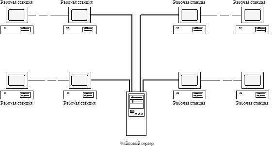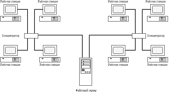 Рис. 10. Пример ЛИВС подразделения с топологией "звезда" Используем для построения ЛИВС топологию типа "шина" (рис. 11). Здесь все рабочие станции разделены на 4 сегмента по 10-15 станций в каждом сегменте. Каждая рабочая станция оснащена одним сетевым адаптером, файловый сервер - четырьмя сетевыми адаптерами. Выбор той или иной топологии диктуется соображениями удобства прокладки сетевого кабеля, необходимостью наращивания ЛИВС и расстоянием между рабочей станцией и файловым сервером (оно не должно превышать 150м). Для постpоения ЛИВС подpазделений пpедполагается использовать стандаpт Fast Ethernet, обеспечивающий скоpость передачи данных 100 Мбит/с.