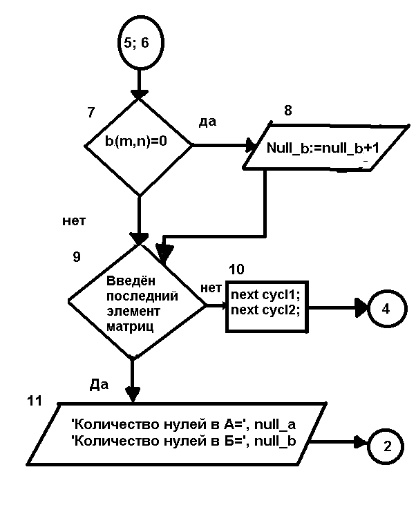 Цель работы. Целью работы является написание программы на языке программирования «Pascal» для DOS с использованием подпрограмм и функций, задания для которых обозначены вариантом лабораторной работы. 2. Постановка задачи. Главной задачей программиста является создание наиболее простого, и, следовательно, быстрого алгоритма программы, выполняющего оба задания – А и Б, причём задание А необходимо оформить в виде процедуры, а задание Б в виде функции. При этом сделать программу как можно проще в использовании. 3. Описание алгоритма программы. Помимо короткого основного модуля программы, который управляет процедурами и функциями, в программу включены две функции и одна процедура, они же и являются подпрограммами, которые было необходимо использовать по условию лабораторной работы. Процедура представляет собой задание А, в котором необходимо было подсчитать количество нулей в матрицах. В программе матрицы представлены двухмерным массивом, числа в которые заносятся автоматически посредством случайного их генератора, после чего над ними производятся вычисления. Необходимо подчеркнуть, что как для занесения в матрицы случайных чисел, так и для подсчёта их нулевых элементов, использовался один двойной цикл оператора FOR. Первая функция – это программное меню, которое предоставляет пользователю программы выбор вычисления заданий и выход. Соответственно вторая функция – это задание Б, для выполнения которого автор программы использовал те же принципы построения подпрограммы, что и для выполнения подпрограммы задания А. 4. Блок-схема программы. См. на следующей странице.