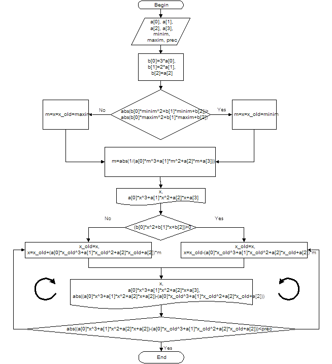 Программа для решения кубических уравнений методом касательных (метод Ньютона). Кубическое уравнение имеет вид a1*x^3+a2*x^2+a3*x+a4=0 Введите значение коэффициента a[1] : 1 Введите значение коэффициента a[2] : -6 Введите значение коэффициента a[3] : -9 Введите значение коэффициента a[4] : 58 Необходимо указать интервал поиска решения. Введите нижнюю границу поиска : 5 Введите верхнюю границу поиска : 6 Введите допустимую погрешность : 0.00005 Исходное уравнение имеет вид : 1x^3+(-6)x^2+(-9)x+(58)=0 Первая производная имеет вид : f'(x)=3x^2+(-12)x+(-9) Вторая производная имеет вид : f''(x)=6x+(-12) ------------------------------------------------- | Xn | f(Xn) | |f(Xn)|/m | ------------------------------------------------- | 6| 4| 0.6666666667| | 5.851851852| 0.2601229487| 0.04335382479| | 5.840787634| 0.001413241032| 0.000235540172| | 5.840726862|4.255405933e-08|7.092343222e-09| ------------------------------------------------- Блок-схема алгоритмаБлок-схема решения и листинг программы, реализующей этот алгоритм на языке программирования С++.