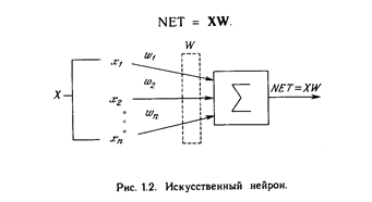 Рис. 1.1. Биологический нейрон. На рис. 1.1 показана структура пары типичных биологических нейронов. Дендриты идут от тела нервной клетки к другим нейронам, где они принимают сигналы в точках соединения, называемых синапсами. Принятые синапсом входные сигналы подводятся к телу нейрона. Здесь они суммируются, причем одни входы стремятся возбудить нейрон, другие - воспрепятствовать его возбуждению. Когда суммарное возбуждение в теле нейрона превышает некоторый порог, нейрон возбуждается, посылая по аксону сигнал другим нейронам. У этой основной функциональной схемы много усложнений и исключений, тем не менее, большинство искусственных нейронных сетей моделируют лишь эти простые свойства. ИСКУССТВЕННЫЙ НЕЙРОН Искусственный нейрон имитирует в первом приближении свойства биологического нейрона. На вход искусственного нейрона поступает некоторое множество сигналов, каждый из которых является выходом другого нейрона. Каждый вход умножается на соответствующий вес, аналогичный синаптической силе, и все произведения суммируются, определяя уровень активации нейрона. На рис. 1.2 представлена модель, реализующая эту идею. Хотя сетевые парадигмы весьма разнообразны, в основе почти всех их лежит эта конфигурация. Здесь множество входных сигналов, обозначенных х 1 , х2 , ... , х n , поступает на искусственный нейрон. Эти входные сигналы, в совокупности обозначаемые вектором X, соответствуют сигналам, п риходящим в синапсы биологического нейрона. Каждый сигнал умножается на соответствующий вес w1 , v2 , ..., и n , и поступает на суммирующий блок, обозначенный S . Каждый вес соответствует «силе» одной биологической синаптической связи. (Множество весов в совокупности обозначается вектором W.) Суммирующий блок, соответствующий телу биологического элемента, складывает взвешенные входы алгебраически, создавая выход, который мы будем называть NET. В векторных обозначениях это может быть компактно записано следующим образом: Активационные функции Сигнал NET далее, как правило, преобразуется активационной функцией F и дает выходной нейронный сигнал OUT. Активационная функ ция может быть обычной линейной функцией где К - постоянная, пороговой функцией OUT = 1, если NET > Т, OUT = 0 в остальных случаях, где Т - некоторая постоянная пороговая величина, или же функцией, более точно моделирующей нелинейную передаточную характеристику биологического нейрона и представляющей нейронной сети большие возможности.