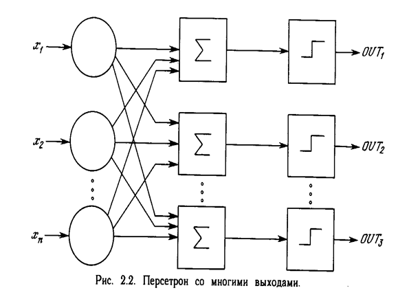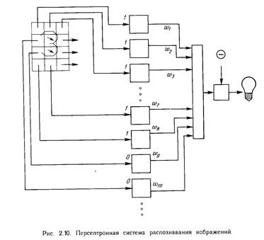 Первое систематическое изучение искусственных нейронных сетей было предпринято Маккалокком и Питтсом в 1943 г. [1]. Позднее в работе [3] они исследовали сетевые парадигмы для распознавания изображений, подвергаемых сдвигам и поворотам. Простая нейронная модель, показанная на рис. 2.1, использовалась в большей части их работы. Элемент S умножает каждый вход х на вес w и суммирует взвешенные входы. Если эта сумма больше заданного порогового значения, выход равен единице, в противном случае - нулю. Эти системы (и множество им подобных) получили название персептронов. Они состоят из одного слоя искусственных нейронов, соединенных с помощью весовых коэффициентов с множеством входов (см. рис. 2.2), хотя в принципе описываются и более сложные системы.