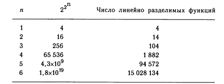 (Взято из R.O.Winder, Single-stage logic. Paper presented at the AIEE Fall General Meeting,1960.) Как видно из табл. 2.2, вероятность того, что случайно выбранная функция окажется линейно разделимой, весьма мала даже для умеренного числа переменных. По этой причине однослойные персептроны на практике ограничены простыми задачами.