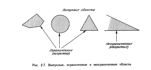 Преодоление ограничения линейной разделимости К концу 60-х годов проблема линейной разделимости была хорошо понята. К тому же было известно, что это серьёзное ограничение представляемости однослойными сетями можно преодолеть, добавив дополнительные слои. Например, двухслойные сети можно получить каскадным соединением двух однослойных сетей. Они способны выполнять более общие классификации, отделяя те точки, которые содержатся в выпуклых ограниченных или неограниченных областях. Область называется выпуклой, если для любых двух ее точек соединяющий их отрезок целиком лежит в области. Область называется ограниченной, если ее можно заключить в некоторый шар. Неограниченную область невозможно заключить внутрь шара (например, область между двумя параллельными линиями). Примеры выпуклых ограниченных и неограниченных областей представлены на рис. 2.7.