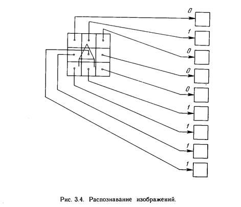 В 60-е годы персептроны вызвали большой интерес и оптимизм. Розенблатт [4] доказал замечательную теорему об обучении персептронов, объясняемую ниже. Уидроу [5-8] дал ряд убедительных демонстраций систем персептронного типа, и исследователи во всем мире стремились исследовать возможности этих систем. Первоначальная эйфория сменилась разочарованием, когда оказалось, что персептроны не способны обучиться решению ряда простых задач. Минский [2] строго проанализировал эту проблему и показал, что имеются жесткие ограничения на то, что могут выполнять однослойные персептроны, и, следовательно, на то, чему они могут обучаться. Так как в то время методы обучения многослойных сетей не были известны, исследователи перешли в более многообещающие области, и исследования в области нейронных сетей пришли в упадок. Недавнее открытие методов обучения многослойных сетей в большей степени, чем какой-либо иной фактор, повлияло на возрождение интереса и исследовательских усилий. Работа Минского, возможно, и охладила пыл энтузиастов персептрона, но обеспечила время для необходимой консолидации и развития лежащей в основе теории. Важно отметить, что анализ Минского не был опровергнут. Он остается важным исследованием и должен изучаться, чтобы ошибки 60-х годов не повторились. Несмотря на свои ограничения, персептроны широко изучались (хотя не слишком широко использовались). Теория персептронов является основой для многих других типов искусственных нейронных сетей, и персептроны иллюстрируют важные принципы. В силу этих причин они являются логической исходной точкой для изучения искусственных нейронных сетей. ПЕРСЕПТРОННАЯ ПРЕДСТАВЛЯЕМОСТЬ Доказательство теоремы обучения персептрона [4] показало, что персептрон способен научиться всему, что он способен представлять. Важно при этом уметь различать представляемость и обучаемость. Понятие представляемости относится к способности персептрона (или другой сети) моделировать определенную функцию. Обучаемость же требует наличия систематической процедуры настройки весов сети для реализации этой функции. Для иллюстрации проблемы представляемости допустим, что у нас есть множество карт, помеченных цифрами от 0 до 9. Допустим также, что мы обладаем гипотетической машиной, способной отличать карты с нечетным номером от карт с четным номером и зажигающей индикатор на своей панели при предъявлении карты с нечетным номером (см. рис. 2.3). Представима ли такая машина персептроном? То есть, может ли быть сконструирован персептрон и настроены его веса (неважно каким образом) так, чтобы он обладал такой же разделяющей способностью? Если это так, то говорят, что персептрон способен представлять желаемую машину. Мы увидим, что возможности представления однослойными персептронами весьма ограниченны. Имеется много простых машин, которые не могут быть представлены персептроном независимо от того, как настраиваются его веса.