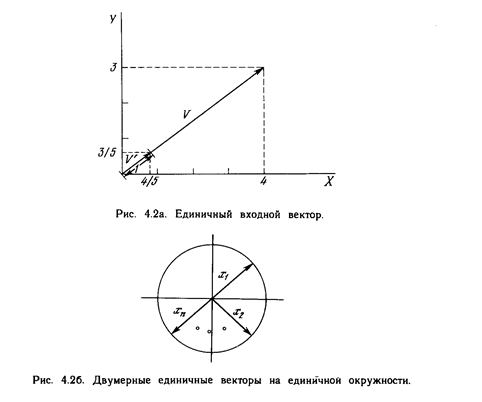 Это превращает входной вектор в единичный вектор с тем же самым направлением, т.е. в вектор единичной длины в n -мерном пространстве. Уравнение (4.6) обобщает хорошо известный случай двух измерений, когда длина вектора равна гипотенузе прямоугольного треугольника, образованного его х и у компонентами, как это следует из известной теоремы Пифагора. На рис. 4.2а такой двумерный вектор V представлен в координатах х-у, причем координата х равна четырем, а координата х - трем. Квадратный корень из суммы квадратов этих компонент равен пяти. Деление каждой компоненты V на пять дает вектор V' с компонентами 4/5 и 3/5, где V' указывает в том же направлении, что и V, но имеет единичную длину. На рис. 4.26 показано несколько единичных векторов. Они оканчиваются в точках единичной окружности (окружности единичного радиуса), что имеет место, когда у сети лишь два входа. В случае трех входов векторы представлялись бы стрелками, оканчивающимися на поверхности единичной сферы. Эти представления могут быть перенесены на сети, имеющие произвольное число входов, где каждый входной вектор является стрелкой, оканчивающейся на поверхности единичной гиперсферы (полезной абстракцией, хотя и не допускающей непосредственной визуализации).