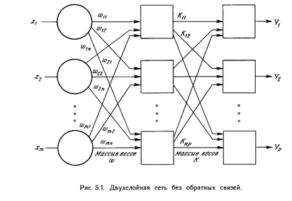 Так как умножение матриц ассоциативно, то X(W1 , W2 ). Это показывает, что двухслойная линейная сеть эквивалентна одному слою с весовой матрицей, равной произведению двух весовых матриц. Следовательно, любая многослойная линейная сеть может быть заменена эквивалентной однослойной сетью. В гл. 2 показано, что однослойные сети весьма ограниченны по своим вычислительным возможностям. Таким образом, для расширения возможностей сетей по сравнению с однослойной сетью необходима нелинейная однослойная функция. Сети с обратными связями. У сетей, рассмотренных до сих пор, не было обратных связей, т.е. соединений, идущих от выходов некото рого слоя к входам этого же слоя или предшествующих слоев. Этот специальный класс сетей, называемых сетями без обратных связей или сетями прямого распространения, представляет интерес и широко используется. Сети более общего вида, имеющие соединения от выходов к входам, называются сетями с обратными связями. У сетей без обратных связей нет памяти, их выход полностью определяется текущими входами и значениями весов. В некоторых конфигурациях сетей с обратными связями предыдущие значения выходов возвращаются на входы; выход, следовательно, определяется как текущим входом, так и предыдущими выходами. По этой причине сети с обратными связями могут обладать свойствами, сходными с кратковременной человеческой памятью, сетевые выходы частично зависят от предыдущих входов. ТЕРМИНОЛОГИЯ, ОБОЗНАЧЕНИЯ И СХЕМАТИЧЕСКОЕ ИЗОБРАЖЕНИЕ ИСКУССТВЕННЫХ НЕЙРОННЫХ СЕТЕЙ. К сожалению, для искусственных нейронных сетей еще нет опубликованных стандартов и устоявшихся терминов, обозначений и графических представлений. Порой идентичные сетевые парадигмы, представленные различными авторами, покажутся далекими друг от друга. В этой книге выбраны наиболее широко используемые термины. Терминология. Многие авторы избегают термина « нейрон» для обозначения искусственного нейрона, считая его слишком грубой моделью своего биологического прототипа. В этой книге термины «нейрон», «клетка», «элемент» используются взаимозаменяемо для обозначения «искусственного нейрона» как краткие и саморазъясняющие. Дифференциальные уравнения или разностные уравнения. Алгоритмы обучения, как и вообще искусственные нейронные сети, могут быть представлены как в дифференциальной, так и в конечно-разностной форме. При исполь зовании дифференциальных уравнений предполагают, что процессы непрерывны и осуществляются подобно большой аналоговой сети. Для биологической системы, рассматриваемой на микроскопическом уровне, это не так. Активационный уровень биологического нейрона определяется средней скоростью, с которой он посылает дискретные потенциальные импульсы по своему аксону. Средняя скорость обычно рассматривается как аналоговая величина, но важно не забывать о действительном положении вещей. Если моделировать искусственную нейронную сеть на аналоговом компьютере, то весьма желательно использовать представление с помощью дифференциальных уравнений. Однако сегодня большинство работ выполняется на цифровых компьютерах, что заставляет отдавать предпочтение конечно-разностной форме как наиболее легко программируемой. По этой причине на протяжении всей книги используется конечно-разностное представление. Графическое пре