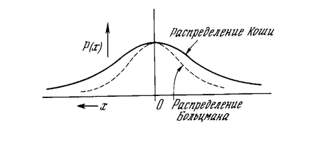 Рис. 5.3. Распределение Коши и распределение Больцмана. В уравнении (5.6) Р(х) может быть проинтегрирована стандартными методами. Решая относительно х, получаем xc = р{ T(t)tg[P (х)]), (5.7) где р - коэффициент скорости обучения; х c - изменение веса. Теперь применение метода Мойте Карло становится очень простым. Для нахождения х в этом случае выбирается случайное число из равномерного распределения на открытом интервале (- p/2, p /2) (необходимо ограничить функцию тангенса). Оно подставляется в формулу (5.7) в качестве Р(х), и с помощью текущей температуры вычисляется величина шага. Метод искусственной теплоемкости Несмотря на улучшение, достигаемое с помощью метода Коши, время обучения может оказаться все еще слишком большим. Способ, уходящий своими корнями в термодинамику, может быть использован для ускорения этого процесса. В этом методе скорость уменьшения температуры изменяется в соответствии с искусственной «теплоемкостью», вычисляемой в процессе обучения. Во время отжига металла происходят фазовые переходы, связанные с дискретными изменениями уровней энергии. При каждом фазовом переходе может иметь место резкое изменение величины, называемой теплоемкостью. Теплоемкость определяется как скорость изменения температуры с энергией. Изменения теплоемкости происходят из-за попадания системы в локальные энергетические минимумы. Искусственные нейронные сети проходят аналогичные фазы в процессе обучения. На границе фазового перехода искусственная теплоемкость может скачкообразно измениться. Эта псевдотеплоемкость определяется как средняя скорость изменения температуры с целевой функцией. В примере шарика в коробке сильная начальная встряска делает среднюю величину целевой функции фактически не зависящей от малых изменений температуры, т.е. теплоемкость близка к константе. Аналогично при очень низких температурах система замерзает в точке минимума, так что теплоемкость снова близка к константе. Ясно, что в каждой из этих областей допустимы сильные изменения температуры, так как не происходит улучшения целевой функции, При критических температурах небольшое уменьшение температуры приводит к большому изменению средней вели чины целевой функции. Возвращаясь к аналогии с шариком, при «температуре», когда шарик обладает достаточной средней энергией, чтобы перейти из А в В, но недостаточной для перехода из В в А, средняя величина целевой функции испытывает скачкообразное изменение. В этих критических точках алгоритм должен изменять температуру очень медленно, чтобы гарантировать, что система не замерзнет случайно в точке А, оказавшись пойманной в локальный минимум. Критическая температура может быть обнаружена по резкому уменьшению искусственной теплоемкости, т.е. средней скорости изменения температуры с целевой функцией. При достижении критической температу ры скорость изменения температуры должна замедляться, чтобы гарантировать сходимость к глобальному минимуму. ОБРАТНОЕ РАСПРОСТРАНЕНИЕ И ОБУЧЕНИЕ КОШИ Обратное распространение обладает преимуществом прямого поиска, т.е. веса всегда корректируются в направлении, минимизирующем функцию ошибки. Хотя время обучения и велико, оно существенно меньше, чем при случайном поиске, выполняемом машиной Коши, когда находится глобальный минимум, но многие шаги выполняются в нев