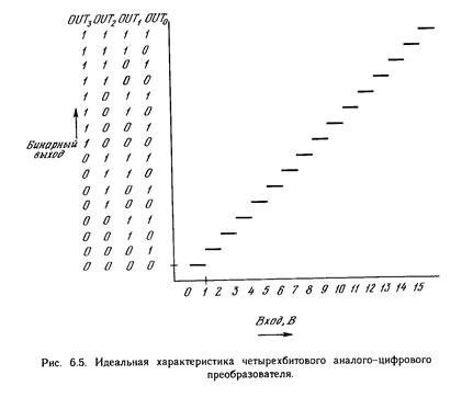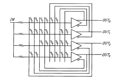 Рис. 6.4. Четырехбитовый аналого-цифровой преобразователь, использующий сеть Хопфилда. Целью является такой выбор сопротивлений (весов), что непрерывно растущее напряжение X, приложенное к одновходовому терминалу, порождает множество из четырех выходов, представляющих двоичную запись числа, величина которого приближенно равна входному напряжению (рис. 6.5). Определим сначала функцию энергии следующим образом: