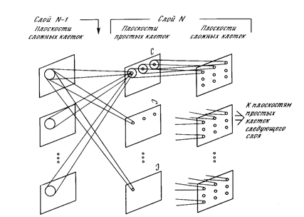 Рис. 10.10. Система неокогнитрона. Комплексные узлы. Задачей комплексных узлов является уменьшение зависимости реакции системы от позиции образов во входном поле. Для достижения этого каждый комплексный узел получает в качестве входного образа выходы набора простых узлов из соответствующей плоскости того же слоя. Эти простые узлы покрывают непрерывную область простой плоскости, называемую рецептивной областью комплексного узла. Возбуждение любого простого узла в этой области является достаточным для возбуждения данного комплексного узла. Таким образом, комплексный узел реагирует на тот же образ, что и простые узлы в соответствующей ему плоскости, но он менее чувствителен к позиции образа, чем любой из них. Таким образом, каждый слой комплексных узлов реагирует на более широкую область входного образа, чем это делалось в предшествующих слоях. Эта прогрессия возрастает линейно от слоя к слою, приводя к требуемому уменьшению позиционной чувствительности системы в целом. Обобщение Каждый нейрон в слое, близком к входному, реагирует на определенные образы в определенном месте, такие, как угол с определенной ориентацией в заданной позиции. Каждый слой в результате этого имеет более абстрактную, менее специфичную реакцию по сравнению с предшествующим; выходной слой реагирует на полные образы, показывая высокую степень независимости от их положения, размера и ориентации во входном поле. При использовании в качестве классификатора комплексный узел выходного слоя с наибольшей реакцией реализует выделение соответствующего образа во входном поле. В идеальном случае это выделение нечувствительно к позиции, ориентации, размерам или другим искажениям. Вычисления Простые узлы в неокогнитроне имеют точно такие же характеристики, что и описанные для когнитрона, и используют те же формулы для определения их выхода. Здесь они не повторяются. Тормозящий узел вырабатывает выход, пропорциональный квадратному корню из взвешенной суммы квадратов его входов. Заметим, что входы в тормозящий узел идентичны входам соответствующего простого узла и область включает область ответа во всех комплексных плоскостях. В символьном виде