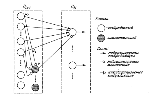 Рис. 10.11. Связи от сложных клеток одного уровня к простым клеткам следующего уровня. На рис. 10.11 показана полная структура синаптических связей между простым узлом и комплексными узлами в предшествующем слое. Каждый простой узел реагирует только на набор комплексных узлов внутри своей рецептивной области. Кроме того, существует тормозящий узел, реагирующий на те же самые комплексные узлы. Веса синапсов тормозящего узла не обучаются; они выбираются таким образом, чтобы узел реагировал на среднюю величину выходов всех узлов, к которым он подключен. Единственный тормозящий синапс от тормозящего узла к простому узлу обучается, как и другие синапсы. Обучение без учителя. Для обучения неокогнитрона на вход сети подается образ, который необходимо распознать, и веса синапсов настраиваются слой за слоем, начиная с набора простых узлов, ближайших ко входу. Величина синаптической связи от каждого комплексного узла к данному простому узлу увеличивается тогда и только тогда, когда удовлетворяются следующие два условия: 1) комплексный узел реагирует; 2) простой узел реагирует более сильно, чем любой из его соседних (внутри его области конкуренции). Таким образом, простой узел обучается реагировать более сильно на образы, появляющиеся наиболее часто в его рецептивной области, что соответствует результатам исследований, полученных в экспериментах с котятами. Если распознаваемый образ отсутствует на входе, тормозящий узел предохраняет от случайного возбуждения. Математическое описание процесса обучения и метод реализации латерального торможения аналогичны описанным для когнитрона, поэтому здесь они не повторяются. Необходимо отметить, что выходы простых и комплексных узлов являются аналоговыми, непрерывными и линейными и что алгоритм обучения предполагает их неотрицательность. Когда выбирается простой узел, веса синапсов которого должны быть увеличены, он рассматривается как представитель всех узлов в плоскости, вызывая увеличение их синаптических связей на том же самом образе. Таким образом, все узлы в плоскости обучаются распознавать одни и те же свойства, и после обучения будут делать это независимо от позиции образа в поле комплексных узлов в предшествующем слое. Эта система имеет ценную способность к самовосстановлению. Если данный узел выйдет из строя, будет найден другой узел, реагирующий более сильно, и этот узел будет обучен распознаванию входного образа, тем самым перекрывая действия своего отказавшего товарища. Обучение с учителем. В работах [3] и [8] описано самоорганизующееся неуправляемое обучение. Наряду с этими впечатляющими результатами, были опубликованы отчеты о других экспериментах, использующих обучение с учителем [9]. Здесь требуемая реакция каждого слоя заранее определяется экспериментатором. Затем веса настраиваются с использованием обычных методов для выработки требуемой реакции. Например, входной слой настраивался для распознавания отрезков линий в различных ориентациях во многом аналогично первому слою обработки зрительной коры. Последующие слои обучались реагировать на более сложные и абстрактные свойства до тех пор, пока в выходном слое требуемый образ не будет выделен. При обработке сети, превосходно распознающей рукописные арабские цифры, экспериментаторы отказались от достижения би