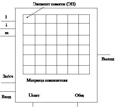 Микросхемы памяти изготавливают по полупроводниковой технологии на основе кремния с высокой степенью интеграции на кристалле, что определяет их принадлежность к БИС. Для самой общей характеристики БИС памяти принимают в расчёт, прежде всего, их информационную ёмкость, быстродействие, энергопотребление. Основной составной частью микросхем ОЗУ является массив элементов памяти, объединенных в матрицу накопителя (рис.1). Элемент памяти (ЭП) может хранить 1 Бит (0 Бит) информации. Каждый ЭП имеет свой адрес. Для обращения к ЭП необходимо его выбрать с помощью кода адреса. ОЗУ которое допускает обращения по адресу к любому ЭП в произвольном порядке, называется ОЗУ с произвольным доступом. Последовательный доступ предусматривает обращение к отдельным ЭП только в порядке возрастания или убывания их адресов.