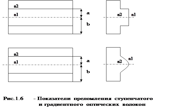 ,где l - длина волны передаваемого излучения, n1 и n2 – показатели преломления материалов ОВ. Различают оптические волокна со ступенчатым профилем, у которых показатель преломления сердцевины n1 одинаков по всему поперечному сечению, и градиентные - с плавным профилем, у которых n1 уменьшается от центра к периферии (рис.1.6). Фазовая и групповая скорости каждой моды в ОВ зависят от частоты, то есть оптоволокно является дисперсной системой. Вызванная этим волноводная дисперсия является одной из причин искажения передаваемого сигнала. Различие групповых скоростей различных мод в многомодовом режиме называется модовой дисперсией. Она является весьма существенной причиной искажения сигнала, поскольку он переносится по частям многими модами. В одномодовом режиме отсутствует модовая дисперсия, и сигнал искажается значительно меньше, чем в многомодовом, однако в многомодовое ОВ можно ввести большую мощность. Оптические волокна имеют очень малое (по сравнению с другими средами) затухание сигнала в волокне. Лучшие образцы российского волокна имеют затухание 0.22 дБ/км на длине волны 1.55 мкм, что позволяет строить линии связи длиной до 100 км без регенерации сигналов. Для сравнения, лучшее волокно Sumitomo на длине волны 1.55 мкм имеет затухание 0.154 дБ/км. В оптических лабораториях США разрабатываются еще более "прозрачные", так называемые фтороцирконатные волокна с теоретическим пределом порядка 0,02 дБ/км на длине волны 2.5 мкм. Лабораторные исследования показали, что на основе таких волокон могут быть созданы линии связи с регенерационными участками через 4600 км при скорости передачи порядка 1 Гбит/с. На сегодняшний день для городской телефонной сети отечественной промышленностью выпускаются кабели марки ОК имеющие четыре и восемь волокон. Конструкция ОК-8 приведена на рис.1. 7. Оптические волокна 1 (многомодовые, ступенчатые) свободно располагаются в полимерных трубках 2. Скрутка оптических волокон – повивная, концентрическая. В центре – силовой элемент 3 из высокопрочных полимерных нитей в пластмассовой трубке 4. Снаружи – полиэтиленовая лента 5 и оболочка 6. Кабель ОК-4 имеет принципиально те же конструкцию и размеры, но четыре ОВ в нем заменены пластмассовыми стержнями. Недостатки волоконно-оптической технологии: А.Необходимы также оптические коннекторы (соединители) с малыми оптическими потерями и большим ресурсом на подключение-отключение. Точность изготовления таких элементов линии связи должна соответствовать длине волны излучения, то есть погрешности должны быть порядка доли микрона. Поэтому производство таких компонентов оптических линий связи очень дорогостоящее. Б.Другой недостаток заключается в том, что для монтажа оптических волокон требуется прецизионное, а потому дорогое, технологическое оборудование. В.Как следствие, при аварии (обрыве) оптического кабеля затраты на восстановление выше, чем при работе с медными кабелями Тем не менее, преимущества от применения волоконно-оптических линий связи (ВОЛС) настолько значительны, что, несмотря на перечисленные недостатки оптического волокна, эти линии связи все шире используются для передачи информации.
