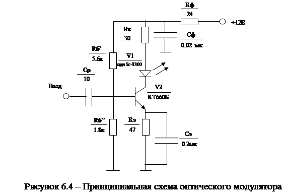 5.3. ВыводыВ данной главе производится выбор способа организации одноволоконного оптического тракта на основе критериев оптимальности и разработка структурной схемы оптического передатчика для выбранного способа построения ВОСП. В главе приведены четыре группы схем построения одноволоконных ВОСП: 1) ВОСП, на основе различных способов разветвления оптических сигналов; 2) ВОСП, основанная на использовании разделения разнонаправленных сигналов по времени; 3) ВОСП, на основе использования различных видов модуляции; 4) ВОСП с одним источником излучения; Наилучшим вариантом реализации одноволоконной ВОСП для соединительной сети ГТС является схема волоконооптической системы связи с модуляцией по интенсивности, с применением оптических разветвителей (рисунок 2.1). Данная схема отличается простотой реализации оптического передатчика и приемника, невысокой стоимостью устройств объединения и разветвления оптических сигналов (оптических разветвителей). Схема обеспечивает длину регенерационного участка до 18 км. Данная схема наилучшим образом удовлетворяет требованиям, предъявляемым к проектируемому оптическому передатчику: 1) Минимальная стоимость и простота реализации; 2) Длина регенерационного участка не менее 8 км; На рис. 3.6 приведена соответствующая структурная схема оптического передатчика. В следующей главе, на основании структурной схемы передатчика, будет разрабатываться его принципиальная схема и электрический расчет основных узлов. 6. Составление и расчёт принципиальной схемы 6.1. Общие соображения по расчёту принципиальной схемы устройстваПервым этапом при проектировании принципиальной схемы передающего устройства ВОСП является выбор типа и марки оптического излучателя исходя из предъявляемых к его техническим характеристикам требований. К основным техническим характеристикам излучателей относятся: - мощность излучения; - длина волны излучения; - ширина спектра излучения; - частота модуляции; - ток накачки; - пороговый ток. Для правильного выбора оптического излучателя в первую очередь следует задаться верным значением мощности излучения. Для этого необходимо определить требуемую оптическую мощность на выходе оптического передающего устройства. Окончательное решение о выборе той или иной марки излучателя принимается на основании соответствия технических характеристик прибора требуемой длине волны излучения, ширине спектра излучения и времени нарастания мощности оптического сигнала. Вторым этапом является выбор транзистора V2 в схеме прямого модулятора (МОД) и расчёт модулятора (Рисунок 6.1). Транзистор вбирают исходя из характеристик определённого на предыдущем этапе оптического излучателя, а именно тока накачки и порогового тока. При этом необходимо учитывать максимально допустимую мощность транзистора и его граничную частоту. Затем задаётся рабочая точка и производится расчёт элементов схемы модулятора. На третьем этапе необходимо рассчитать согласующий усилитель(СУС). Здесь представляется целесообразным использование быстродействующего операционного усилителя, включенного по схеме преобразователя напряжение – ток (рисунок 6.1). Требуется правильно выбрать тип операционного усилителя в соответствии с требуемой верхней частотой и рассеиваемой мощностью, а также рассчитать элементы с