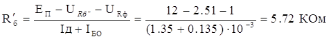 Аналогично найдём сопротивление Rб’: Для схемы с эмиттерной стабилизацией напряжение питания распределяется между тремя резисторами выходной цепи (Rэ, Rк, Rф), лазерным излучателем и транзистором: ,где Uд = 2 В – падение напряжения на полупроводниковом лазере; URф – падение напряжения на сопротивлении в цепи коллектора.