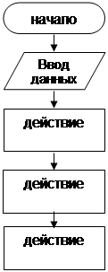 · псевдокоды (полуформализованные описания алгоритмов на условном алгоритмическом языке, включающие в себя как элементы языка программирования, так и фразы естественного языка, общепринятые математические обозначения и др.); Псевдокод представляет собой систему обозначений и правил, предназначенную для единообразной записи алгоритмов. Псевдокод занимает промежуточное место между естественным и формальным языками. С одной стороны, он близок к обычному естественному языку, поэтому алгоритмы могут на нем записываться и читаться как обычный текст. С другой строны, в псевдокоде используются некоторые формальные конструкции и математическая символика, что приближает запись алгоритма к общепринятой математической записи. В псевдокоде не приняты строгие синтаксические правила для записи команд, присущие формальным языкам, что облегчает запись алгоритма на стадии его проектирования и дает возможность использовать более широкий набор команд, рассчитанный на абстрактного исполнителя. Однако в псевдокоде обычно имеются некоторые конструкции, присущие формальным языкам, что облегчает переход от записи на псевдокоде к записи алгоритма на формальном языке. В частности, в псевдокоде, так же, как и в формальных языках, есть служебные слова, смысл которых определен раз и навсегда. Они выделяются в печатном тексте жирным шрифтом, а в рукописном тексте подчеркиваются. Единого или формального определения псевдокода не существует, поэтому возможны различные псевдокоды, отличающиеся набором служебных слов и основных (базовых) конструкций. Примером псевдокода является школьный алгоритмический язык в русской нотации (школьный АЯ), описанный в учебнике А.Г. Кушниренко и др. "Основы информатики и вычислительной техники", 1991. Этот язык в дальнейшем мы будем называть просто "алгоритмический язык". Пример записи алгоритма на школьном АЯ: алг Сумма квадратов (арг цел n, рез цел S) дано | n > 0 надо | S = 1*1 + 2*2 + 3*3 + ... + n*n нач цел i ввод n; S:=0 нц для i от 1 до n S:=S+i*i кц вывод "S = ", S кон · Формальные языки ( QBasic, Pascal и тд.). Пример: Основные алгоритмические конструкции:Линейный алгоритм.В алгоритмическом языке линейным является алгоритм, состоящий из команд, выполняющихся одна за другой. Они в записи алгоритма располагаются в том порядке, в каком должны быть выполнены предписываемые ими действия. Такой порядок выполнения называется естественным. Последовательность команд образует составную команду «цепочка», которая в записи блок-схемой имеет вид, приведенный на рисунке 1.