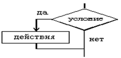 Рис.1 Блок-схема линейного алгоритма. В математике к линейным алгоритмам относятся алгоритмы, представленные формулами. Они наиболее просты для программирования. Заметим, что естественный способ кодировки формул делает программу легкочитаемой, но нередко приводит к лишним вычислениям, поэтому, чтобы избежать повторных вычислений и сократить общее количество операций выполняйте тождественные преобразования выражений. С другой стороны, надо знать, что не всегда следует осуществлять оптимизацию, поскольку она является не правилом, а исключением. Этому есть три причины, главная из которых состоит в том, что оптимизация ухудшает наглядность программ, вторая - выгоды от оптимизации должны быть существенными и третья - современные системы, как правило, имеют удовлетворительные оптимизирующие компиляторы. Основные алгоритмические конструкции:Ветвящийся алгоритм.При исполнении алгоритмов приходится не только находить значения величин, но и анализировать их свойства, сравнивать их друг с другом и в зависимости от результата сравнения выбирать ту или иную ветвь алгоритма. Алгоритмы, имеющие несколько ветвей, называются нелинейными. К таким относятся разветвляющиеся и циклические алгоритмы. Для их записи применяются составные команды. Базовая структура "ветвление". Определяет выполнение действий в зависимости от выполнения условия. Каждый из путей ведет к общему выходу, так что работа алгоритма будет продолжаться независимо от того, какой путь будет выбран.