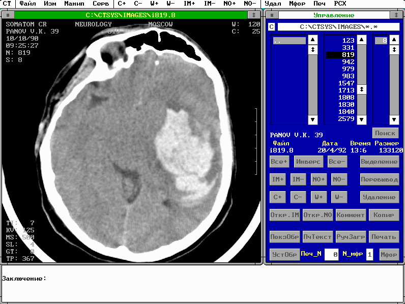 Окно Управление Окно Управление является управляющим окном 2D режима и позволяет реализовывать основные функции работы с изображением: выбор, печать, копирование, удаление и т.д., управлять настройкой системы и запускать внешние приложения. В окне отображаются функциональные кнопки, таблица выбора-выделения изображений, подокна отображения. В верхней части окна находится подокно с путем директория, в котором выбираются изображения, под ним - таблица с тремя списками: в левом - поддиректории, в среднем - номера объектов, в правом - номера срезов. Вначале в таблице находятся списки соответствующие стандартному пути нахождения изображений: c:\ctsys\images (параметр image в файле ct.cfg). В верхней строке списка директориев находится строка «..» и далее список поддиректориев, если он есть. Для смены директория щелкните мышью на имени поддиректория в списке, либо на строке «..» (выход в старший директорий). В каждом списке имеется курсор (серый или черный), цвет активного курсора - черный. Курсор, указывающий на изображение, перемещается стрелками вверх и вниз на одну позицию; на лист - клавишами PgUp, PgDn; в начало и конец списка - клавишами Home, End. Кроме того, справа от каждой таблицы находится линейка для перемещения курсора. Ею пользуются в случае, если список изображений не умещается в таблице. Вверху и внизу линейки находятся кнопки стрелка вверх и стрелка вниз - при нажатии на них мышью курсор перемещается на одну позицию. На линейке находится движок; если навести на него курсор мыши, нажать левую кнопку мыши и, не отпуская ее, переместить мышь вверх или вниз, то движок переместится на новое место линейки и после отпускания кнопки мыши произойдет перевывод другого фрагмента списка. Другой способ перевывода фрагмента списка - щелкнуть мышью сверху или снизу от движка. Как, не выходя из системы, получить текст помощи. Для получения подсказки о работе с каким-нибудь элементом панели наведите курсор мыши на этот элемент (но не щелкайте!) и нажмите на клавиатуре компьютера F1 - выведется окно с текстом подсказки. Для получения подсказки работы с архивом наведите курсор мыши на элемент меню Архив (но не щелкайте!) и нажмите на клавиатуре F1; если текст превышает размеры экрана его можно листать, щелкая мышью над кнопками выведенными внизу текста (ДАЛЬШЕ, НАЗАД); для выхода из режима подсказки нажмите на клавиатуре Esc. Как выбрать нужное изображение. Для загрузки изображения щелкните мышью на номере нужного пациента или на номере нужного среза в таблице выбора панели Управление - активный курсор перейдет на этот номер. Далее нажмите кнопку Откр.IM или повторно щелкните мышью (изображение выведется в окно Изображение). Для загрузки объекта - выберите объект и нажмите кнопку Откр.NO. В окно Изображение выведутся все изображения данного объекта. Для выбора изображения по фамилии надо воспользоваться кнопкой Поиск. Произойдет вывод окна поиска. Поиск осуществляется по шаблону, вводимому в одноименное поле. Шаблон – это текст с искомыми начальными символами (от 1 до 25 символов). Поиск осуществляется в директории, выведенной в вверху окна, и, если параметр «Включая поддирекории» имеет значение «да», во всех поддиректориях, по точному совпадению с учетом регистров, при нажатии кнопок Искать и Искать дальше. Кнопка Искать дальше используется, когда начальные символы из