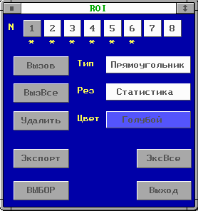 Выбор зоны интереса осуществляется в зависимости от типа зоны. Для прямоугольной зоны левая верхняя граница зоны устанавливается при нажатии левой кнопки мыши. Зона расширяется до нужного уровня и ограничивается нажатием правой кнопки. Если в процессе расширения зоны выясняется, что следует изменить начальную точку зоны, необходимо вновь нажать левую кнопку мыши в нужном месте и повторить вновь процесс задания зоны. Для круглой зоны сначала выводится окружность, привязанная к маркеру мыши. Ее размер меняется нажатием кнопок «стрелка вверх» и «стрелка вниз». Перемещая мышь и меняя размеры окружности, выбирается зона. Фиксация зоны производится путем нажатия любой кнопки мыши. Выбор центра эллипсоидальной зоны производится путем нажатия левой кнопки мыши. Затем перемещением маркера мыши изменяются радиусы эллипса в вертикальном и горизонтальном направлении. Фиксация зоны производится при нажатии правой кнопки мыши. Для произвольной зоны выбирается начальное положение контура с помощью левой кнопки мыши. Затем каждое нажатие левой кнопки формирует новый элемент ломаной линии контура произвольной зоны. При непрерывно нажатой левой кнопке зона формируется из смежных точек. Замыкание зоны производится нажатием правой кнопки мыши. Внимание: избегайте пересечений при формировании контура произвольной зоны, иначе результат будет некорректным. Когда в качестве типа зоны установлено все изображение, никаких действий для определения зоны не требуется. Для работы с зоной интереса, прежде всего надо установить ее номер. Подокна с номерами зон (от 1 до 8) отображены вверху окна ROI в виде горизонтального ряда; для установки нужного номера надо наехать курсором на подокно с этим номером и щелкнуть левой кнопкой мыши; подокно с установленным номером выделяется цветом. Следующий шаг - установка параметров зоны интереса. Каждая зона характеризуется набором параметров, отображаемых подокнами в правой части окна ROI: Цвет: Черный/ Синий/ Зеленый/ ЗеленоГолубой/ Красный/ Фиолетовый/ Коричневый/ СветлоСерый/ Серый/ Голубой/ СветлоЗеленый/ ЯркоЗеленоГолуб/ ЯркоКрасный/ СветлоФиолет/ Желтый/ Белый/ Выключен - цвет при выделении текущей зоны, для изменения параметра надо наехать курсором на подокно и щелкнуть левой кнопкой мыши нужное число раз, при значении Выключен - выключается цветовое выделение значений в зоне; ROI Тип: Прямоугольник/ Окружность/ Эллипс/ Произвольная/ Все изображ. - выбор типа зоны интереса: прямоугольная, круглая, эллипсоидальная, произвольная или все изображение, для изменения параметра надо наехать курсором на подокно и щелкнуть левой кнопкой мыши нужное число раз; ROI Рез: Статистика/ Гистограмма - выбор отображения статистики или статистики и гистограммы при анализе зоны, для изменения параметра надо наехать курсором на подокно и щелкнуть левой кнопкой мыши; Теперь можно выделить выбранную зону на изображении, для чего в окне ROI надо нажать кнопку Выбор, после чего надо перевести курсор на изображение и выделить зону. При включенном цветовом выделении предварительно надо выбрать точку на изображении, значение которой будет центром томографического окна выделения, то есть после нажатия кнопки Выбор надо навести курсор на нужную точку и нажать левую кнопку мыши. После выделения зоны в окне изображения отображаю