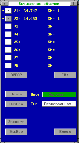 Для работы с объемом, прежде всего надо установить его номер. Подокна с номерами объемов (от 1 до 8) отображены вверху окна Объемы в виде вертикального ряда; для установки нужного номера надо наехать курсором на подокно с этим номером и щелкнуть левой кнопкой мыши; подокно с установленным номер выделяется цветом. Далее надо установить параметры зоны интереса аналогично тому, как это делается в функции ROI. Для вычисления объемов необходимо выделить зону интереса на каждом срезе. Зона интереса выделяется аналогично функции ROI кнопкой Выбор или вызывается кнопками Вызов и ВызВсе. Результаты вычисления объемов отображаются в окне Объемы в строке с соответствующим номером объема. Для смены номера среза служит кнопка IM+. Для передачи результатов вычисления выделенного объема или всех объемов в окно с заключением надо нажать, соответственно, кнопки Экспорт и ЭксВсе. Для перехода к вычислениям объемов других объектов служат три элемента меню Объемы: Нов_NO - загрузка нового объекта, NO+ - переход к следующему объекту, NO - переход к предыдущему объекту. При нажатии клавиши F1 выводится текст помощи. Выход из функции Объемы - кнопка Выход. Как пользоваться калькулятором. Для работы с калькулятором необходимо активизировать окно Изображения (если оно не было активным), в верхнем меню войти в подменю Изм и выбрать функцию Калькулятор. На экран выводится панель калькулятора, которая имеет вид: