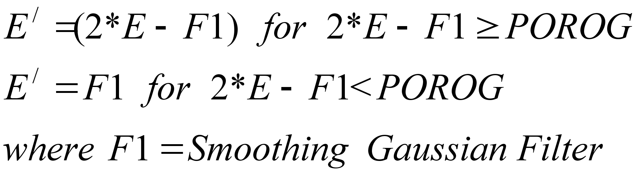 где P(x,y) - фильтруемая центральная точка P(r) - пиксель внутри выбранной матрицы R1/R2 - радиус матрицы фильтруемого фрагмента изображения в пикселях в X,Y направлениях S1,S2 - весовой фактор в X,Y направлениях r - радиус пикселя Edge-enhancing filter