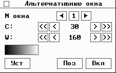 Движок вертикальной линейки меняет текущий центр всех трех диапазонов, а горизонтальной - общую ширину трех диапазонов, которая делится на три. Первый диапазон находится в пределах между числами D1 и D2, второй - между D2 и D3 и третий - между D3 и D4. Значение центра равно (D1+D4)/2. Выход из функции - гашение окна (квадрат в левом верхнем углу). Функция Создать объем обеспечивает построение объемного представления по серии последовательных срезов. При вызове функции вызывается меню настройки параметров объемного представления: