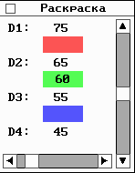 Выключается окно приведением кнопки Вкл/ Вык в состояние Вык и нажатием кнопки Уст. Кнопка Поз при нажатии перевыводится как Нег и служит для перехода от позитива к негативу и наоборот. Функция Раскрасить позволяет раскрашивать изображение - она выводит пиксели, попавшие в один из трех заданных диапазонов, соответственно одним из трех цветов: красным, зеленым или синим. Диапазоны выбираются с помощью линеек выводимого при обращении к функции окна, приведенного ниже.