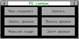 Функция Установка окон обеспечивает возможность сохранять, редактировать и выбирать текущее окно из семи пар чисел (C,W). При входе в функцию выводится окно ввода, где помимо указанных семи пар чисел, выведены 2 параметра и 7 кнопок с номерами окон (от 0 до 6) и кнопка Отказ. Текущее окно имеет номер 0. Первый параметр имеет два значения (при нажатии меняются на противоположное). Первое значение - Установка выбранного окна. При этом если нажать на кнопки с 1 по 6, соответствующие значения C и W перепишутся в текущее (0) окно пере выведется изображения и функция завершится. Второе значение Фиксация текущего в выбранном приводит к тому, что при нажатии кнопок с 1 по 6 произойдет запоминание значений C0 и W0 в соответствующей паре. Второй параметр включает/выключает двойное окно-изображение выводится одновременно в двух окнах (всегда 0 и 1). Чтобы установить двойное окно, надо при выходе нажать кнопку 0. То есть, кнопки 1-6 всегда устанавливают одинарное окно. Установить заранее подготовленные окна можно также с помощью клавиатуры - клавишами 0-6 (0-включает/выключает двойное окно) Что еще можно делать с помощью меню окна Изображения. Функция Удал производит удаление либо изображения выведенного в окно Изображения, либо заранее выделенных изображений, перед удалением выводится окно подтверждения. Функция Мфор производит подготовку экрана для вывода на мультиформатную камеру. Если в вашем компьютере имеется соответствующее оборудование (плата FrameGrabber) и к нему присоединена мультиформатная камера, происходит вывод на нее. Выход из этого режима - нажатие любой клавиши. Функция Печ действует в режиме загрузки объекта. Если есть выделенные изображения, они печатаются с ранее установленными параметрами. Какие параметры системы можно установить элементом подменю Setup меню CT. Выводится окно изменения системных параметров. В нем можно установить следующие параметры системы: - тип меню, - масштаб при импорте сечений из 3D, - шаг изменения уровня С, - шаг изменения уровня W, - цвет надписей, - цвет надписей при печати с экрана, - цвет линий, - порт принтера. Как работать с видеосигналом - окно FG Сервис Окно FG Tools состоит из шести функциональных кнопок и меню.