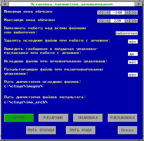 Эти параметры можно менять. Внизу под параметрами выведены два ряда клавиш. В первом ряду четыре клавиши для выбора нужной работы: АРХИВ РАЗАРХИВ УПАКОВКА РАСПАКОВКА. Предварительно выбранная работа подсвечена зеленым цветом; если надо сменить работу щелкните левой кнопкой мыши на нужной клавише. Для каждой работы в файле pasoudes.dat заводится по две строки с путями исходной и результирующей директории в следующем порядке: распаковка, упаковка, разархивирование, архивирование. Значения этих строк, т.е. пути можно менять клавишами ПУТЬ ОТКУДА и ПУТЬ КУДА Во втором ряду - клавиши: ПУТЬ ОТКУДА для выбора пути исходного директория ПУТЬ КУДА для выбора пути директория результата Отказ отказ от функции. Значения параметров обрезки определяют процедуру, производимую над изображением перед упаковкой, которая состоит в том, что все числа, отображаемые пикселями изображения, (например, для рентгено-томограммы это числа Хаунсфилда) меньшие минимума приравниваются минимуму, а большие максимума приравниваются максимуму, все остальные числа остаются без изменения. Это означает, что при последующей распаковке мы получим числа только в диапазоне окна обрезки. То есть, при сужении окна обрезки происходит некая потеря информации; в виде компенсации за эту потерю мы получаем более эффективную упаковку. Соответственно вышеизложенному, значения минимума и максимума окна обрезки выбираются так, чтобы это окно включало бы в себя все значимые числа изображения. Значение параметра "Выполнить работу над всеми файлами или выборочно" "над всеми" приводит к тому, что после запуска работа будет выполнена над всеми файлами изображений в соответствующем поддиректории без участия оператора. Значение "выборочно" приводит к тому, что после запуска программа будет ждать от оператора действий, описанных ниже. Значение параметра "Удалять исходные файлы при работе с архивом" "да" приводит к удалению соответственно архивируемых или разархивируемых файлов; значение "нет" исключает удаление. Следующий параметр позволяет выводить сообщения о неудачах упаковки-распаковки и тогда оператор может прервать этот процесс. Следующие два параметра позволяют задать режим создания архива из упакованных или неупакованных изображений и режим разархивирования до упакованных или до неупакованных изображений. При нажатии на клавиши выбора путей ПУТЬ ОТКУДА, ПУТЬ КУДА выводится соответствующее окно. Выбранные пути отображаются в окне работы с архивом. После выбора параметров и путей для запуска программы работы с архивом надо щелкнуть левой кнопкой мыши на заранее выбранной клавише работы (т.е. на клавише зеленого цвета). Все окна исчезнут, и запустится программа упаковки/распаковки и работы с архивом, которая описана ниже. Процедура архивирования изображений заключается в упаковке файлов с изображениями (если они не были предварительно упакованы) и в соединении упакованных файлов, относящихся к одному пациенту, в один файл. Упаковка файлов с изображениями производится по определенному алгоритму и дает выигрыш в 4-5 раз. Процедура разархивирования обратна процедуре архивирования. Согласно системным соглашениям неупакованные, упакованные, и архивные изображения располагаются в разных директориях, начальные пути которых определяются в файле ct.cfg. Пути исходной и рез