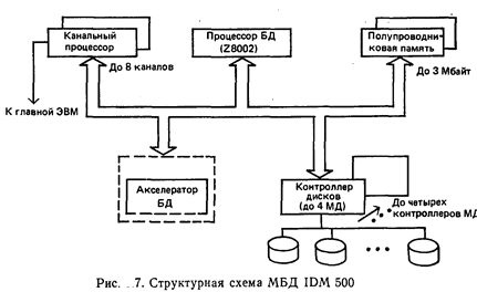 Два свойства DBC 1012 характерны для всех сетевых МЕД: обеспечение возможности увеличения мощности наращиванием числа обрабатывающих процессоров, так что производительность при этом растет линейно (показатель линейности роста производительности DBC 1012 от числа процессоров составляет 97%); обеспечение надежности функционирования за счет дублирования данных в локальных УМП (т. е. обеспечивается работа без краха системы при выходе из строя отдельных процессоров или УМП). Третье направление исследований в области МБД заключается в создании недорогих коммерческих устройств на серийных процессорных элементах с шинным интерфейсом (топология таких МБД изображена на рис. 2,а). В качестве примера рассмотрим МБД фирмы Britton Lee IDM 500, структурная схема которой изображена на рис. 7. Хотя эти изделия не ориентированы на высокопараллельную обработку и содержат ограниченное число функциональных процессоров, они удовлетворяют сформулированным выше принципам МН МБД и полностью реализуют все основные функции МБД. Структурная схема коммерческих МБД является частным случаем МН МБД (см. рис. 2,a). Роль СБП выполняет полупроводниковая память, к которой через общую шину подключаются периферийные контроллеры НМД со встроенными микропроцессорами AMD 2901, процессор обработки (процессор БД) на основе Z8002 и до 8 канальных процессоров для подключения к главной ЭВМ (канал IBM 370, интерфейс с VAX 750) или подключения к локальной сети (Ethernet). Кроне того, к общей шине может подключаться особый функциональный процессор (акселератор БД) для выполнения тех операций, которые являются узким местом (например, сортировка отношений). Старшая модель IDM SOO/XL с емкостью внешней памяти более 1 Гбайт на жестких МД и 500 Мбайт на МЛ имеет производительность 1000 транзакций/мин и одновременно обслуживает до 400 пользователей. Развитием этого направления в разработках фирмы Britton Lee явился реляционный файлсервер (data/file server) RS310 - автономное устройство, подключаемое к локальной сети Ethernet или непосредственно к главной ЭВМ по интерфейсу RS232. Он включает: собственно процессор базы данных (1 плата) на основе 28000 (10 Мгц); соединенную с этим процессором оперативную память емкостью 1 Мбайт на одной плате; два жестких диска типа винчестер (5 1/4 дюйма) по 80 Мбайт каждый с соответствующим контроллером; контроллер кассетной МЛ с 60 Мбайт на кассете (Streaming tape 1/4 дюйма); до четырех интерфейсных плат двух типов (интерфейс RS232 с восемью выходами или интерфейс локальной сети Ethernet). Каждая интерфейсная плата содержит процессор 28000 и свою локальную память. ,RS310 может быть использован или как автономная СУБД с выходным языком SQL, поддерживая при этом все функции СУБД, за исключением первого этапа трансляции с SQL (управление транзакциями, параллельное выполнение запросов, откаты и восстановления, автоматическую оптимизацию запросов и т. п.), или как интегрированная система управления файлами. При этом RS310 выступает для главной ЭВМ в качестве интеллектуального контроллера с буферизацией и удовлетворяет интерфейсу SCSI (Small Computer System Interface). RS310 обеспечивает одновременную работу до 50 пользователей и выполняет одновременно до 10 запросов. Ближайшая перспектива развития RS310 - увеличение внешней памяти до восьми НМД емкостью 478 Мбайт и МЛ емкостью 300 Мбайт.