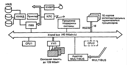 Рис. 8. Специализированная машина для БД PYRAMID S 9810 (9820) Дальнейшим развитием такого подхода к созданию коммерческих МБД является их реализация на модульной параллельной мультимикропроцессорной системе типа систем S27 и S81 фирмы Sequent и систем серии 9000 (9810, 9820) фирмы Pyramid-Sybase. На рис. 8 изображена структурная схема нового изделия фирмы Pyramid--система 9810(9820), являющаяся специализированной ЭВМ для БД. Эта специализированная машина предназначена для автономной поддержки СУБД Sybase с входным языком SQL, а также для поддержки прикладных информационных систем на основе этой СУБД для автоматизации конторской деятельности, разработки программного обеспечения и т. п. Система работает как data computer в сети ЭВМ и имеет интерфейс не только с локальной сетью Ethernet, но и Х25, telenet, darpa. Общая дисковая память достигает 15 Гбайт. Основная память, подключаемая к устройству управления памятью в виде плат до 4 и 16 Мбайт, может наращиваться до 128 Мбайт. В системе поддерживается виртуальное адресное пространство 4 Гбайт со страницами в 2048 байт. В качестве процессоров обработки выступают один или два спецпроцессора (CPU), реализованные в виде 32-разрядных процессоров с RISC-архитектурой. CPU имеет следующие характеристики: время цикла- 100 нс; В RISC-процессорах реализован конвейерный режим выполнения инструкций. Основой системы является собственная сверхбыстрая шина xtend К общей шине подключается до 16 портов с интерфейсом RS232 для обслуживания интеллектуальных терминальных процессоров, с помощью которых к системе могут подключаться терминальные пользователи. Подключение к шине адаптера шины MULTIBUS открывает широкие возможности для подключения вспомогательных внешних устройств, в которых реализован интерфейс этой шины. Управление системой осуществляется процессором поддержки системы, в функции которого входят также диагностика всех устройств и системы в целом, сервисная служба системы и т. п. В этом процессоре функционирует так называемая двухпортовая многопроцессорная операционная система, которая соединяет в себе две версии UNIX ОС: System V. AT&T и 4.0 Berkly. Перспективы развития МБД Создание высокопроизводительных МВД связывается с решением следующих проблем, по которым ведутся интенсивные исследования. 1. Создание специализированных архитектур МВД, сочетающих достоинства горизонтального параллелизма при выполнении одной операции с функциональным параллелизмом при выполнении последовательности операций и транзакций. Особую роль здесь играет реализация конвейерной потоковой обработки (data flow) применительно к операциям реляционной алгебры.