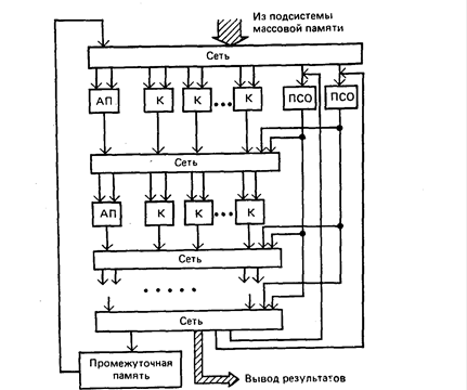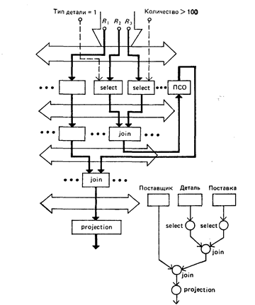 Рис. 5.9. Структура подсистемы потоковой обработки в МВД DFRU Управление выполнением запросов при этом должно происходить собственно потоками данных, что облегчает задачу программного контроля выполнением операций, синхронизации их и т. п. Например, в проекте DFRU предпринята попытка аппаратно реализовать потоковую обработку в регулярной структуре обрабатывающих процессоров (рис. 9). Основным обрабатывающим элементом является универсальный компаратор кортежей (К). В матрице компараторов кортежей, соединяемых коммутирующими сетями, возможна динамическая коммутация выходов процессоров обработки i-го уровня со входами процессоров (i+1)-го уровня. В каждой строке матрицы по одному арифметическому процессору (АП) для реализации агрегатных функций. Связи между процессорами устанавливаются в соответствии с дугами дерева запроса (дерева реляционных операций). Это позволяет отображать дерева запроса в дерево процессоров, вырезаемых в данной матрице, так что каждой операции назначается один процессор обработки. После этого исходные отношения в потоке читаются из подсистемы массовой памяти и обрабатываются конвейерно в настроенном дереве процессоров, так что кортежи, образованные в операции i-го уровня, через коммутирующую сеть попадают в соответствующий процессор (i+l)-го уровня. На рис. 10 проиллюстрирован этот процесс для следующего запроса: «Выдать имена поставщиков, которые поставляют более 100 деталей типа I» применительно к трем исходным отношениям: (RI) ПОСТАВЩИК (КОД ПОСТАВЩИКА, имя);