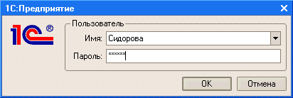 Для выполнения аутентификации средствами 1С:Предприятия пользователь, при начале работы с прикладным решением, должен выбрать (или ввести) имя пользователя и соответствующий этому имени пароль: