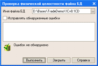 Утилита предназначена для автономной проверки и исправления файловой базы данных без запуска конфигуратора. Важно, чтобы выбранная для проверки информационная база не была открыта в режиме Конфигуратора или 1С:Предприятия.
