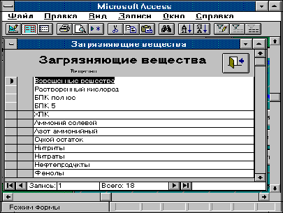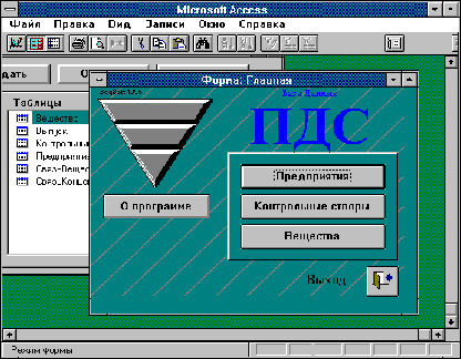 ПРОЕКТУ Тема: “Проектирование и реализация базы данных” Выполнил студент гр. Э-282: Богдановский А. А. Принял преподаватель: Сухомлинов А. И. ________________________ Дата: “ ” января 1996 г. ОГЛАВЛЕНИЕ СПИСОК ЛИТЕРАТУРЫ 7 Приложение I. Отчет по летней практике по теме \“Инфологическое моделирование\ 8 Приложение II. Программные тексты, запросы и схема данных 13 Приложение III. Таблицы данных с информацией 17 Приложение IV. Примеры отчетов 19 Постановка задачиЛаборатория инженерной океанологии (ЛИО) при дальневосточном научно-исследовательском гидрометеорологическом институте (ДВНИГМИ) производит расчеты предельно-допустимых сбросов (ПДС) для предприятий различных видов деятельности. Расчет производится с помощью специальных программ расчета ПДС по методике /1/. Разработать и реализовать базу данных (БД) “ПДС”, обеспечивающую хранение, накопление и предоставление всей информации о предприятии-заказчике, необходимой для программы расчета ПДС. Разработка базы данных “ПДС”Разработка базы данных “ПДС” проводилась в работе по летней практике. В этой работе была составлена полная инфологическая модель базы данных с типами сущностей, типами связей, их атрибутами и графическим представлением модели. Отчет по вышеуказанной летней практике представлен в данной пояснительной записке в приложении I. Реализация базы данных “ПДС”База данных “ПДС” была реализована на СУБД Microsoft Access 2.0 в среде Microsoft Windows 3.1 * . При выборе СУБД использовались /3-5/. В качестве руководства по генерации таблиц, экранных форм, запросов, отчетов, по программированию макрокоманд и программных модулей использовалась /2/. База данных вместе с таблицами данных, экранными формами, запросами, отчетными формами в Microsoft Access представляется в одном файле. База данных “ПДС” хранится в файле PDS.MDB. Схема данных, тексты макрокоманд и программное описание элементов управление приведены в разделе . Описание реализованного рабочего места (АРМ) на основе базы “ПДС” приводится в разделе настоящей записки. Схема данных и программные текстыТак как представление структуры базы данных, экранных форм, запросов, отчетных форм в Microsoft Access обеспечивается внутренней реализацией СУБД (в отличие от распространенных СУБД типа dBase, FoxPro, и т. д., в которых эти характеристики описываются программным путем), то представление полного программного кода базы данных, написанной на Microsoft Access является невозможным, в связи с отсутствием такового. Однако, при создании экранных форм для присвоения различных функций элементам управления - кнопкам - использовался внутренний язык СУБД - Access Basic. Некоторые процедуры, написанные на этом языке, представлены в приложении II. В базе данных “ПДС” для генерации двух отчетов используется два запроса. Хотя эти запросы генерировались визуальными средствами, но есть возможность представить их в виде SQL-запроса. Эти два SQL-запроса представлены также в приложении II. Для связи таблиц баз данных, также как и для запросов, используется визуальная генерация. Схема данных в графическом виде представлена также в приложении II. Описание автоматизированного рабочего местаВ результате работы было создано автоматизированное рабочее место (АРМ) в виде набора связанных экранных форм и отчетов, позволяющее вводить, редактировать, просматривать данные по предприятиям, по выпускам предприятий