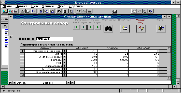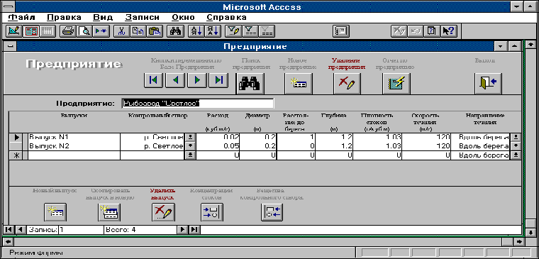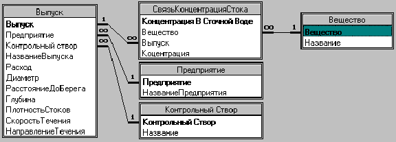 Приложение IV. Примеры отчетов ОТЧЕТ ПО ВЫПУСКАМ ПРЕДПИЯТИЯ Информация о выпусках предприятия Название предприятия: Рыбзавод "Светлое" Название выпуска: Выпуск N1 Расход: 0.02 куб. м/с Диаметр: 0.2 м Расстояние до берега: 1 м Глубина: 1.2 м 120 м/с Скорость течения: Название предприятия: Рыбзавод "Светлое" Название выпуска: Выпуск N2 Расход: 0.05 куб. м/с Диаметр: 0.2 м Расстояние до берега: 0 м Глубина: 1.2 м 120 м/с Скорость течения: ОТЧЕТ ПО ЗАГРЯЗНЯЮЩИМ ВЕЩЕСТВАМ ВЫПУСКА Концентрации веществ по выпуску Выпуск N1 Предприятие: Рыбзавод "Светлое" Вещество Концентрация (мг/л) БПК полное 2.4 Азот аммонийный 0.01 Нитраты 0.001 Минерализация 0 Нефтепродукты 0.005 Хлориды (для пресн.) 10 Амминосульфаты (гр. СПАВ) 1.2 Нитриты 0.0003 Сульфаты 0 * Базы данных Microsoft Access принадлежат к типу реляционных баз данных. В таких базах данных сведения, относящиеся к различным вопросам, сохраняются в отдельных таблицах. Возможность вывода информации из базы данных обеспечивается указанием соотношений между объектами. (вырезка из /2/). Владивосток 1996 M Дальневосточный Государственный Технический Университет Кафедра Технической Кибернетики и Информатики ОТЧЕТ по летней практике Тема: “Инфологическое моделирование базы данных” Студент группы Э-282: Богдановский А. А. Преподаватель: Сухомлинов А. И. Владивосток 1995 Постановка задачиСоставить инфологическую модель базы данных (БД), необходимой для предоставления информации программе расчета предельно-допустимых сбросов (ПДС) сточных вод предприятий в прибрежную зону моря. Эта программа производит расчет максимально-допустимых концентраций загрязняющих веществ в выпусках сточной воды Предприятие, для которого производится расчет ПДС может иметь несколько выпусков. Каждый выпуск характеризуется своими техническими параметрами, которые учитываются в расчетах. Каждый выпуск имеет свой набор загрязняющих веществ. Для каждого выпуска существует свой контрольный створ (точка на море, отстоящая от места выпуска на 50-500 м, в которой производится замер концентраций загрязняющих веществ). Несколько выпусков могут иметь один и тот же контрольный створ, но не наоборот. Расчет производится для каждого выпуска в отдельности в два этапа. Первый - это расчет для каждого загрязняющего вещества индивидуального ПДС (без учета других веществ) по специальной методике*. Для этого расчета требуются следующие данные: фоновая концентрация вещества в контрольном створе, концентрация вещества в сточных водах выпуска, диаметр выпускного отверстия, минимальная скорость морского течения в месте выпуска, расход сточных вод, угол истечения стоков относительно поверхности моря, расстояние от выпуска до поверхности моря, до берега и до ближайшей границы водопользования (т. е. до контрольного створа), коэффициент неконсервативности (КНК) вещества, предельно допустимая концентрация (ПДК) вещества в контрольном створе. Второй этап - расчет ПДС для каждого вещества на основе индивидуального ПДС с учетом других веществ, находящихся в одной группе с одинаковым лимитирующим фактором вредности (ЛФВ) или в одной группе с одинаковым классом опасности. Распределение веществ по группам ЛФВ и классам опасности происходит в зависимости от типа водопользования предприятия, для которого считается ПДС. Проектируемая БД должна содержать информацию по всем предприятиям, для 