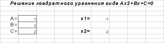 | Формирование таблицы по решению квадратного уравнения вида Ах2+Вх+С=0 Создание файла. Файл создается из пункта меню ФАЙЛ опцией СОЗДАТЬ. Появляется таблица, Устанавливаем параметры страницы через опцию ПАРАМЕТРЫ СТРАНИЦЫ меню ФАЙЛ (установка полей, размера бумаги, колонтитулов и т.д.). На листе появляется пунктирная линия, обозначающая границы листа. Набор таблицы. В ячейку А1 набираем фразу «Решение квадратного уравнения вида Ах2+Вх+С=0, и выделяем ячейки строки А от 1 до той которая находится перед пунктирной линией. Форматируем расположение, начертание и размер букв через опцию ЯЧЕЙКИ меню ФОРМАТ. В подпанели Выравнивание устанавливаем значение «Центрировать по выделению». В подпанели Шрифт - размер и начертание букв (у нашем варианте это полужирный курсив и размер 14). Устанавливаем курсор на ячейке В4 и набираем А=, в ячейке В5 - В=, в ячейке В6 - С=, и производим форматирование по описанному выше методу. Ячейки С4, С5 и С6 выделяем рамкой в подпанели Рамка панели ЯЧЕЙКИ меню ФОРМАТ. Эти ячейки предназначены для ввода в них значений А, В, С. Набор формулы. В ячейках Е4 и Е6 пишем соответственно х1= и х2=, и форматируем по методу, описанному выше. А в ячейки F4 и F6 записываем формулы так. Сначала ставится равно, потом значение ячейки В5 нажатием на ней мышки, функция Корень вставляется из пункта меню ВСТАВКА - ФУНКЦИЯ... Выбираем из математических функций - КОРЕНЬ. И нажимаем кнопку Далее - для ввода значения, находящегося под корнем. Следуя формуле дискриминанта вводим B5^2-(4*B4*B6), а общий вид формулы - =(-B5 + КОРЕНЬ(B5^2-(4*B4*B6)))/(2*B4) Такую же формулу вставляем и в ячейку F6, но сознаком минус: =(-B5 - КОРЕНЬ(B5^2-(4*B4*B6)))/(2*B4) Теперь после ввода пользователем значений А,В,С в ячейки В4, В5 и В6, в ячейках F4 и F6 будут выводится соответственно значения х1 и х2. Сам Лист сохраняется опцией СОХРАНИТЬ КАК... из меню ФАЙЛ. Оттуда же производится и печать Листа. Вид таблицы в программе Excel.