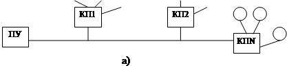 (Рассказать где используется такая структура — нефте-газопроводы) Цепочечной структурой СУРО непосредственно связана с шинной топологией для рис.1а, или с последовательно соединенными через некоторое устройство шинами (рис. 1б). Шинная топология (магистральная) , — топология при которой станции подключаются к шинному магистральному каналу (линейная шина (linear bus)). Данная топология относится к наиболее простым и широко распространенным топологиям ЛВС.