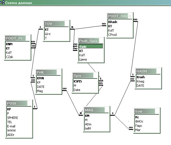 2.1 Внемашинное информационное обеспечение К внемашинному информационному обеспечению относятся товары в магазинах, товары поступающие в магазины, фактически работающие продавцы, документы поставщиков, продаваемые товары. 2.1.1 Инфологическая или информационная модель (схема данных) и ее описание
