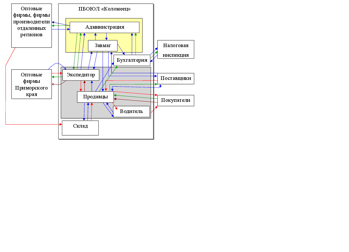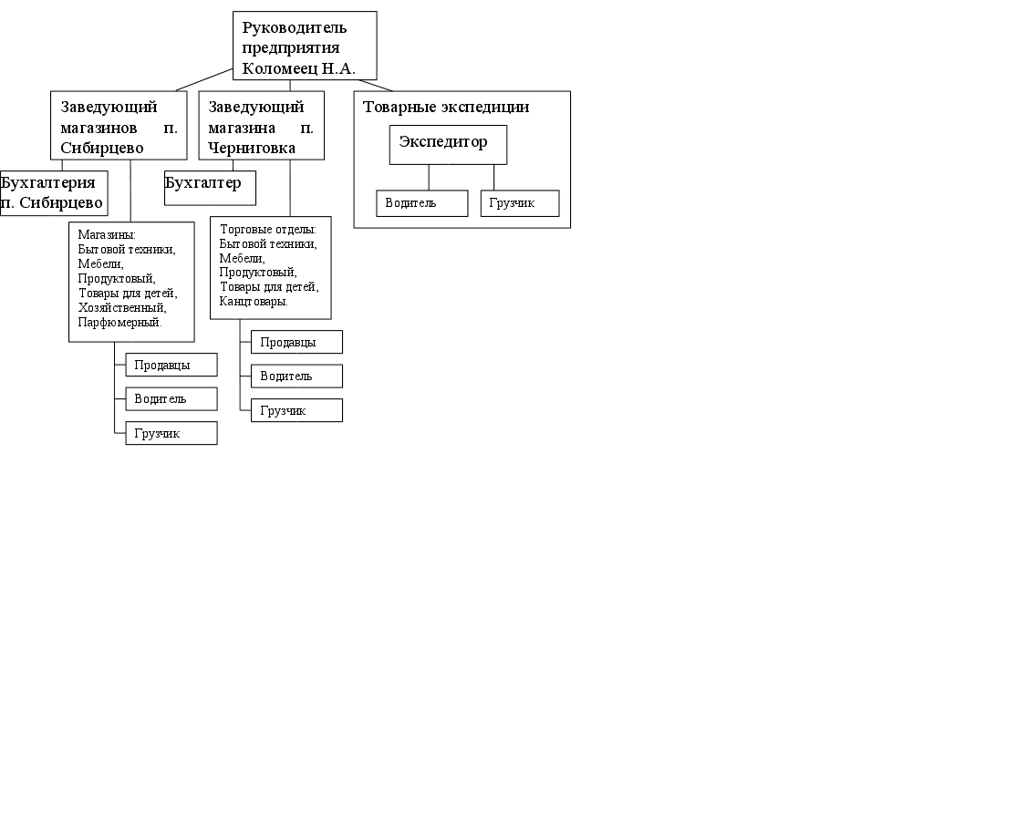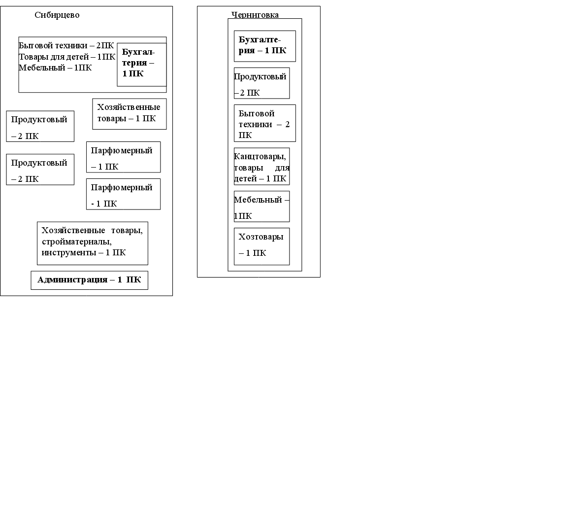 Рис 1.1. Структура экономической системы ПБОЮЛ «Коломеец» Экономическая информационная система (ЭИС) представляет собой совокупность организационных, технических, программных и информационных средств, объединенных в единую систему с целью сбора, хранения, обработки и выдачи необходимой информации, предназначенной для выполнения функций управления. [5] В построенных по такому принципу экономических системах вся информация из внешней среды (нормативная законодательная информация, поступающая из государственных учреждений; информация о конъюнктуре рынка) напрямую поступает в систему управления (информационный поток 1 – ИП1), из системы управления во внешнюю среду идет ИП2, представляющий собой совокупность отчетной финансовой информации в государственные органы, потребителям и кредиторам. ИП3 включает различную организационную, плановую информацию, поступающую из органов управления на объект управления. Сотрудники объекта управления работают с данными, содержащимися в документах ЭИС (ИП4): делают регламентированные отметки относительно имеющихся данных (например, фиксируют продажу товара), составляют отчёты в систему управления. [5] Одной из функций поддерживаемых ЭИС является учёт. Хозяйственный учет представляет собой совокупность бухгалтерского, оперативного и статистического учета. Учет – одна из наиболее трудоемких функций управления. Отличительной чертой учета является большая массовость и однородность исходных и итоговых показателей. Как правило, итоговые показатели формируются путем многократной группировки по различным признакам исходных первичных данных без применения сложных расчетов. Продукция поступает от оптовых фирм и реализуется непосредственно потребителям, нуждающимся в данном виде товаров. Организация осуществляет транспортировку продукции с оптовых баз в магазины, ее складирование, хранение, продажу и доставку потребителям в случае необходимости. Номенклатура реализуемых товаров составляет несколько тысяч наименований и постоянно увеличивается. Наибольший ассортимент предоставляют магазины продуктов и бытовой техники. Организация ведет розничную торговлю за наличный расчет. Удовлетворяя потребности потребителям, предприятие розничной торговли получает доход от торговой надбавки на продаваемые товары. Во внешней системе ПБОЮЛ «Коломеец» выполняет роль посредника между оптовыми торговыми организациями и конечными потребителями. Наглядно это можно увидеть из рисунка 1.1 ПБОЮЛ «Коломеец» – среднее по величине предприятие, штат которого состоит из нескольких десятков человек. В штат входят руководитель предприятия, завмаги, бухгалтера, продавцы, экспедиторы, водители, грузчики. Организационная структура фирмы представляет собой схему изображенную на рисунке 1.2. Она главным образом определяется географическим положением магазинов (рис. 1.3) : в посёлке Сибирцево 7 магазинов, каждый определённой категории товаров, а в посёлке Черниговка 1 большой магазин с пятью торговыми отделами.