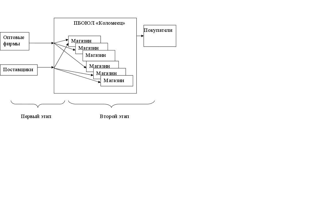Рис. 1.4. Этапы товародвижения. Бухгалтерский учет реализации товаров на данном предприятии осуществляется по мере поступления денег в кассу от покупателей и ежемесячном пересчёте товаров оставшихся в магазине (ревизия). Схема товародвижения в ЭИС предприятия выглядит как показано на рис. 1.5.