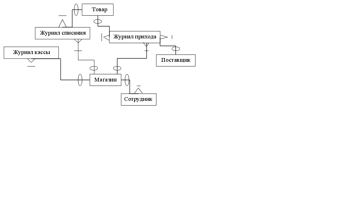 Не весь необходимый магазинам товар представлен оптовыми фирмами нашего региона, поэтому владельцем лично ведётся поиск новых видов товара в глобальной сети Интернет. Найдя интересующий товар по приемлемой цене, владелец связывается по телефону с фирмой предлагающей этот товар для обсуждения всех условий оплаты и доставки, затем по электронной почте производит заказ. Как правило, заказываются относительно большие партии товара, так как по сравнению с работой экспедиторов, когда товар привозится в течение полусуток, товар, заказанный у отдаленных фирм, доставляется железнодорожным транспортом и имеет большие сроки доставки: до полутора месяцев. Фирма, получив заказ, по электронной почте присылает счёт на оплату. Владелец поручает оплатить счёт через банк бухгалтеру. По прибытии товар определяется на склад. Вопросом расширения и обновления ассортимента занимаются экспедитор и завмаг. Экспедитор исследует предложения фирм-оптовиков и докладывает о появлении интересных предложений завмагу. Завмаг принимает решение: везти или не везти определённый вид товара. Если завмаг не уверен, то он советуется с руководителем предприятия. Аналогичная работа ведётся завмагом и с поставщиками. Работа продавцов с покупателями состоит в следующем: а) покупатель в торговом зале выбирает товар; б) продавец предоставляет товар покупателю; в) покупатель расплачивается; г) если покупатель желает, чтобы магазин доставил товар, покупатель сообщает адрес и платит за доставку; д) продавец записывает адрес, наименование товара и его количество в документе «Доставка»; е) продавец отдает товар и документ «Доставка» водителю, обслуживающему магазин; ж) водитель доставляет товар по указанному адресу, просит расписаться в документе «Доставка» покупателя напротив надписи «Претензий не имею». Затем водитель отдаёт документ продавцу; з) в случае бракованного товара, продавец принимает товар от покупателя на замену, и отдает его в зависимости от того, откуда поступил товар экспедитору или поставщику; и) в случае, когда не купленный товар испорчен и нет возможности вернуть его поставщику (например когда срок годности товара истекает после того как товар куплен у поставщиков но ещё не продан) тогда товар списывается, то есть в журнале списания делается запись о наименовании и количестве товара и дате списания, затем товар как правило выбрасывается. В работе с поставщиками и экспедиторами продавцы принимают товар и расплачиваются за него, а также меняют бракованный товар. Диаграмма «сущность-связь» обеспечивающая процесс товародвижения на данном предприятии выглядит, как показано на рисунке 1.6.