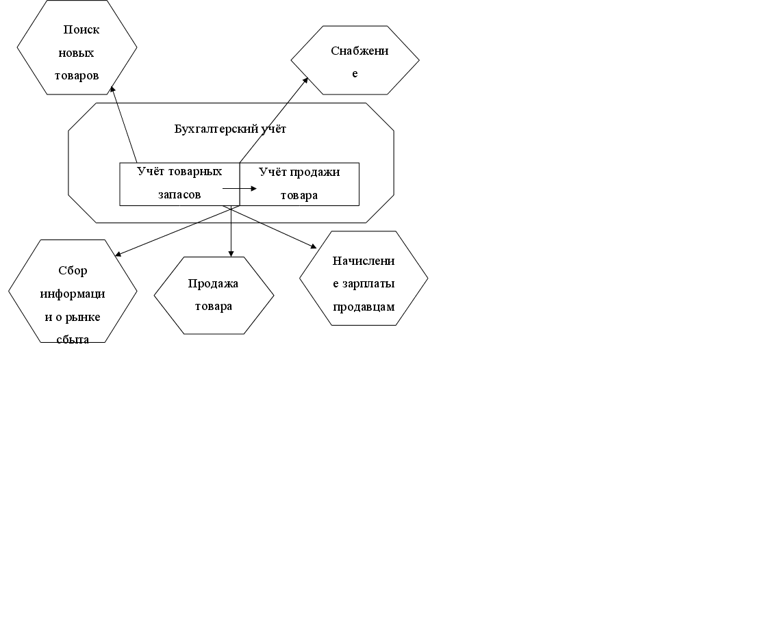Рис. 1.7. Схема взаимосвязи задачи учета товарных запасов с другими задачами. Прежде всего, учет товарных запасов является частью бухгалтерского учёта. Следовательно, он тесно связан с остальными задачами бухгалтерского учёта, такими как отчётность, учёт продажи товара. На данном предприятии розничной торговли задача учёта продажи товара полностью зависит от задачи учёта запасов товара, так как учет продажи товара на предприятии определяется только как разница завезённого товара и вырученной от продажи суммы. Для того чтобы определить количество проданного товара по наименованиям бухгалтер отнимает от количества закупленного товара, количество товара оставшегося в магазине. А для того чтобы определить количество товара оставшегося в магазине его поштучно пересчитывают продавцы. Из этого следует, что учёт товарных запасов автоматически связан с задачами, которые связаны с учётом продажи товаров. Главное предназначение учёта товарных запасов – предоставление информации задаче снабжения. Задачу снабжения выполняют экспедиторы. Для него продавцы с определенной периодичностью, два раза в неделю, составляют заявку. Для этого они осматривают прилавки, примерно пересчитывают оставшийся товар, и приблизительно оценивают, какой товар и сколько нужно заказать, чтобы его хватило до следующей поездки экспедитора за товаром. На основе этих данных составляется заявка. В ней указывается: Наименование товара, примерное количество требующегося товара, Цена в магазине. Аналогично происходит составление заявки для поставщиков. Задача поиска новых товаров всегда требует информации о товарных запасах для предотвращения закупки уже имеющегося или исключённого из продажи товара. Для того чтобы принять решение о закупке предлагаемого поставщиком или экспедитором товара завмагу нужно выяснить, не поставляется ли этот товар уже из других источников. Для этого он изучает документы закупок или спрашивает продавцов, о наличии данного товара в магазине. На базе проблемы управления ценами товаров существует задача изучения рынка сбыта. В неё входит изучение ассортимента и цен конкурентов. После выполнения этой задачи сопоставляются данные о ценах и ассортименте конкурентов с данными магазина фирмы и принимает решения по регулированию ассортимента и цен. Продавцы при продаже пользуются информацией о состоянии товарных запасов, когда, например, покупатель желает купить большую партию товара. При наличии развитых коммуникационных средств они бы пользовались еще информацией о состоянии запасов других магазинов фирмы той же специализации в том случае, когда покупатель хотел бы купить какой-то товар, но его не было бы в этом магазине, а был бы в другом. Учет товарных запасов играет большую роль в расчёте заработной платы продавцам. Заработная плата высчитывается по следующей формуле: Зарплата = Выручка * Процент – Недостача; Недостача = Проданный товар – Выручка; Проданный товар = Остаток + Завезённый товар – Товар в магазине – Списанный товар. Зарплата составляет процент от выручки за минусом недостачи. Недостача определяется как разница проданного товара в денежном выражении и выручки магазина за период. Сумма проданного товара определяется как разница сумм остатка прошлого периода и завезённого товара данного периода минус с
