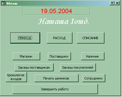 Рис 3.4. Форма «Меню» 3 Технологическое обеспечение 3.1 Организация технологии сбора, передачи, обработки и выдачи информации Собираемая информация для операций приходования, продажи, списания товара: о магазинах, поставщиках, товаре, сотрудниках. О магазинах информация однократно заносится с помощью клавиатуры компьютера в таблицу Mag после приобретения нового магазина. О поставщиках информация однократно заносится с помощью клавиатуры компьютера в таблицу Post из копий его документов перед выполнением операций, после принятия завмагом решения о сотрудничестве с данным поставщиком. О новом товаре информация однократно заносится с помощью клавиатуры компьютера в таблицу Tov перед выполнением операций. О сотрудниках информация однократно заносится с помощью клавиатуры компьютера в таблицу Sotr из копии его паспорта после положительного решения о приёме на работу. Для выполнения операций приходования, продажи, списания товара: