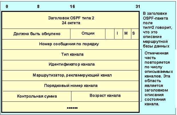 Рисунок 4.11 Маршрутизаторы обмениваются сообщениями из баз данных OSPF, чтобы инициализировать, а в дальнейшем актуализовать свои базы данных, характеризующие топологию сети. Обмен происходит в режиме клиент-сервер. Клиент подтверждает получение каждого сообщения. Формат пересылки записей из базы данных представлен на рисунке. 4.11 Поля, начиная с тип канала, повторяются для каждого описания канала. Так как размер базы данных может быть велик, ее содержимое может пересылаться по частям. Для реализации этого используются биты I и М. Бит I устанавливается в 1 в стартовом сообщении, а бит M принимает единичное состояние для сообщения, которые являются продолжением. Бит S определяет то, кем послано сообщение (S=1 для сервера, S=0 для клиента, этот бит иногда имеет имя MS). Поле номер сообщения по порядку служит для контроля пропущенных блоков. Первое сообщение содержит в этом поле случайное целое число M, последующие M+1, M+2,...M+L. Поле тип канала может принимать следующие значения: Таблица 4.4 - Коды типов состояния каналов (LS)