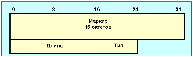 Рисунок 4.25 Поле маркер содержит 16 октетов и его содержимое может легко интерпретироваться получателем. Если тип сообщения "OPEN", или если код идентификации в сообщении OPEN равен нулю, то поле маркер должно быть заполнено единицами. Маркер может использоваться для обнаружения потери синхронизации в работе BGP-партнеров. Поле длина имеет два октета и определяет общую длину сообщения в октетах, включая заголовок. Значение этого поля должно лежать в пределах 19-4096. Поле тип представляет собой код разновидности сообщения и может принимать следующие значения:
