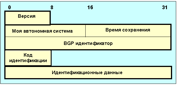 Рисунок 4.26 Поле версия описывает код версии используемого протокола, на сегодня для BGP он равен 4. Двух-октетное поле моя автономная система определяет код AS отправителя. Поле время сохранения характеризует время в секундах, которое отправитель предлагает занести в таймер сохранения. После получения сообщения OPEN BGP-маршрутизатор должен выбрать значение времени сохранения. Обычно выбирается меньшее из полученного в сообщении OPEN и значения, определенного при конфигурации системы (0-3сек). Время сохранения определяет максимальное время в секундах между сообщениями KEEPALIVE и UPDATE или между двумя UPDATE-сообщениями. Каждому узлу в рамках BGP приписывается 4-октетный идентификатор (BGP-identifier, задается при инсталляции и идентичен для всех интерфейсов локальной сети). Если два узла установили два канала связи друг с другом, то согласно правилам должен будет сохранен канал, начинающийся в узле, BGP-идентификатор которого больше. Предусмотрен механизм разрешения проблемы при равных идентификаторах. Одно-октетный код идентификации позволяет организовать систему доступа, если он равен нулю, маркер всех сообщений заполняется единицами, а поле идентификационных данных должно иметь нулевую длину. При неравном нулю коде идентификации должна быть определена процедура доступа и алгоритм вычисления кодов поля маркера. Длина поля идентификационных данных определяется по формуле: Длина сообщения = 29 + длина поля идентификационных данных. Формат UPDATE-сообщения