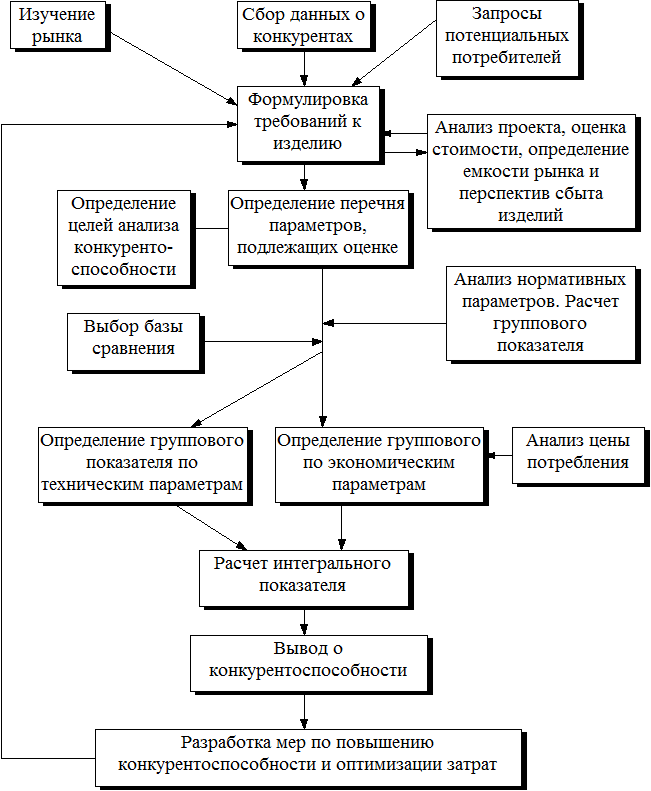 Рис 1.1. Общая схема конкурентоспособности. 1.2. Выбор номенклатуры параметров, используемых при оценке 1.2.1. Оценка конкурентоспособности основывается на сравнении характеристик анализируемой продукции с конкретной потребностью и выявлении их соответствия друг другу. Для объективной оценки необходимо использовать те же критерии, которыми оперирует потребитель, выбирая товар на рынке. Следовательно, должна быть решена задача определения номенклатуры параметров, подлежащих анализу и существенных с точки зрения потребителя. 1.2.2. Номенклатура параметров, используемых при оценке конкурентоспособности, включает две обобщающие группы: параметров качества (технических); экономических параметров. 1.2.2.1. К группе технических относятся параметры потребности, которые характеризуют содержание этой потребности и условия ее удовлетворения. К ним относятся: параметры назначения; эргономические параметры; эстетические параметры; нормативные параметры. 1.2.2.2. Параметры назначения характеризуют области применения продукции и функции, которые она предназначена выполнять. По ним можно судить о содержании полезного эффекта, достигаемого с помощью применения данной продукции в конкретных условиях потребления. Параметры назначения подразделяются: на классификационные параметры, характеризующие принадлежность продукции к определенному классу и используемые при оценке только на этапе выбора области применения продукции и товаров - конкурентов, они служат базой для последующего анализа и в дальнейших расчетах не участвуют (пример: пассажировместимость, скорость вращения); параметры технической эффективности, характеризующие прогрессивность технических решений, используемых при разработке и изготовлении продукции (например, производительность станка, точность и быстрота срабатывания измерительных приборов, объем памяти для ЭВМ), они могут быть и одновременно и классификационными; конструктивные параметры, характеризующие основные проектно - конструкторские решения, использованные при разработке и производстве изделия (состав изделия, его структура, размеры, вес), отдельные параметры также могут служить целям классификации; 1.2.2.3. Эргономические параметры, характеризующие продукцию с точки зрения ее соответствия свойствам человеческого организма при выполнении трудовых операций или потреблении (гигиенические, антропометрические, физиологические, свойства человека, проявляющиеся в производственных и бытовых процессах); 1.2.2.4. Эстетические параметры, характеризующие информационную выразительность (рациональность формы, целостность композиции, совершенство производственного исполнения продукции и стабильность товарного вида), они моделируют внешнее восприятие продукции и отражают именно такие ее внешние свойства, которые являются для потребителя наиболее важными, они ранжируются по степени значимости для конкретного вида продукции; 1.2.2.5. Нормативные параметры, характеризующие свойства продукции, которые регламентируются обязательными нормами, стандартами и законодательством на рынке, где эту продукцию предполагается сбывать (параметры патентной чистоты, характеризующие степень воплощения в продукции технических решений и не подпадающих под действие патентов, выданных в странах предполагаемого сбыта, эколо