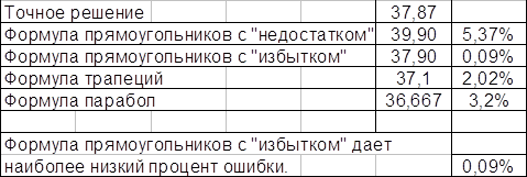 2. В ячейку F13 вводим формулу точного решения (12) =D35*СТЕПЕНЬ(D33;3)/3+D36*СТЕПЕНЬ(D33;2)/2+D37*D33-(D35*СТЕПЕНЬ(D34;3)/3+D36*СТЕПЕНЬ(D34;2)/2+D37*D34) (17) 3. В ячейку F14 вводим формулу прямоугольников "с недостатком" (13) =h * СУММ (D21:D28) (18) 4. В ячейку F14 вводим формулу прямоугольников "с избытком" (14) =h*СУММ (D22:D29) (19) 5. В ячейку F16 вводим формулу трапеций (15) =h/2*(D21+2*D22+2+D23+2*D24+2*D25+2*D26+2*D27+2*D28+D29) (20) 6. В ячейку F17 вводим формулу парабол (16) =h/3*(D21+2*(D22+D24+D26+D28)+4*(D23+D25+D27)+D29) (21) 7. В соответствующие ячейки G14:G17 введем формулы определения погрешности измерений по различным формулам в процентах, например, для ячейки G14 (процент ошибки при определении площади по формуле прямоугольников "с недостатком" =ABS(E35-E34)/E34 (22) 8. Для нахождения предпочтительного варианта вычисления воспользуемся функцией, определяющей минимальное значение в списке аргументов (ячеек G14:G17). Тогда для ячейки G20 получим =МИН(G14:G17) (23) 9. Полученную таблицу через буфер обмена вставляем в пояснительную записку Таблица 4