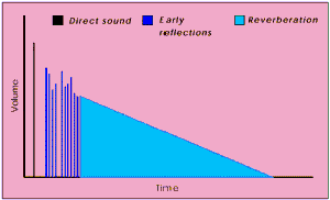 На иллюстрации слева показано распределение звуковых сигналов в зависимоти от уровня громкости и продолжительности во времени. EnvironmentFX позволяет моделировать различные типы акустики за счет использования специальных алгоритмов, рассчитывающих ранние отражения и реверберацию. При этом истоник каждого из ранних отраженных звуков может позиционироваться индивидуально в 3D пространстве. Для того, чтобы переходы между различными помещениями (читай разными аустическими средами) были плавными и естественными предусмотрены специальные фильтры, причем алгоритм EnvironmentFX динамически переконфигурируется переключаясь на нужный. Имеется возможность динамического регулирования уровня интенсивности реверберации для каждого источника звука индивидуально. EnvironmentFX специально ориентирована на воспроизведение через мультиколоночную конфигурацию акустики с использованием технологии MultiDrive, но при этом допускается воспроизведение звука и через две колонки или наушники. Для моделирования различных акустических сред EnvironmentFX использует параметры самого истоника звука (интенсивность, расположение в пространстве) и параметры окружающей среды. Для воспроизведения звука вокруг пользователя EnvironmentFX использует следующие характеристики: · Direct-to-reverberant sound ratio - соотношение уровней громкости основных звуков и реверберации. Уровень громкости основного звука становится интенсивнее при достижении ушей слушателя и становится тише, когда уходит на задний план. В тоже время уровень громкости реверберации приблизительно неизменен вне зависимости от расстояния между слушателем и источником звука. Сооношение уровней громкости основного звука и реверберации дает слушателю важную информацию для оценки расстояния до истоника звука. · Room size - размеры помещения. В маленьком помещении, например холле, расстояние между отраженными звуковыми волнами мало, т.е. отраженные звуки близки друг к другу и довольно быстро формируют остаточную реверберацию. В большом помещении, например ангаре для самолетов, наоборот, отраженные волны преодолевают большие расстояния и для формирования реверберации требуется больше времени. · High-frequency cut-off - отбрасывание высокочастотных компонент звука. Когда материал стен или объхектов отражает звук, не все частотные компоненты отражаются с одинаковой степенью. Большинство материалов поглащают частоты определенного значения, т.е отбрасывается часть высокочастотных компонент. Например в ванной комнате отражаются звуки с частотой вплоть до 14000 Гц, а вгостинной комнате с коврами на стенах отбрасываются все компоненты с частотой более 2000 Гц. · Early reflection level - уровень интенсивности ранних отражений. Ранние отражения дают возможность пользователю определить наличие близких объектов и стен. Чем больше предметов и стен находится близко к пользователю тем большим будет процент ранних отражений в общей звуковой картине. Например, близкорасположенные стены из кирпича в коридоре формируют большое количество ранних отражений,а открытое трявяное поле не формирует ни одного раннего отраженного звука. · Reverberation level - уровень интенсивности реверберации. Уровень громкости реверберации может варьироваться при смене одного помещения на другое. · Reverberation decay time - время затухания реверберации. Это время, необходимое для того, чтобы 