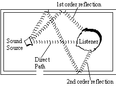 Технология ZoomFX в отличие от MacroFX не является прозрачной для интерфейсов и игр. Для ее поддержки будет создано расширение для DirectSound3D, подобно EAX, с помощью которого разработчики игр смогут воспроизводить новые звуковые эффекты и использовать такой параметр источника звука, как размер. Пока эта технология находится на стадии завершения. EnvironmentFX Технология EnvironmentFX создана для моделирования звука окружающей среды и рассчитана на использование со стандартными интерфейсам типа EAX и I3DL2. По сути, технология EnvironmentFX позволяет воспроизводить эффект реверберации, описывая то, как звуки достигают ушей слушателя в зависимости от параметров помещения. Помещением может быть и открытое пространство и маленькая келья монаха. Когда слушатель находится в помещении с истоником звука он сначала слышит звук, достигший его ушей по прямому пути, затем, чуть поздее, он сылшит ранние отражения (звуки несколько раз отразившиееся от стен или объектов) и в самый последний момент он слышит реверберацию, т.е. поле остаточных отраженных звуков, затухающее со временем.